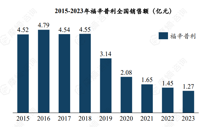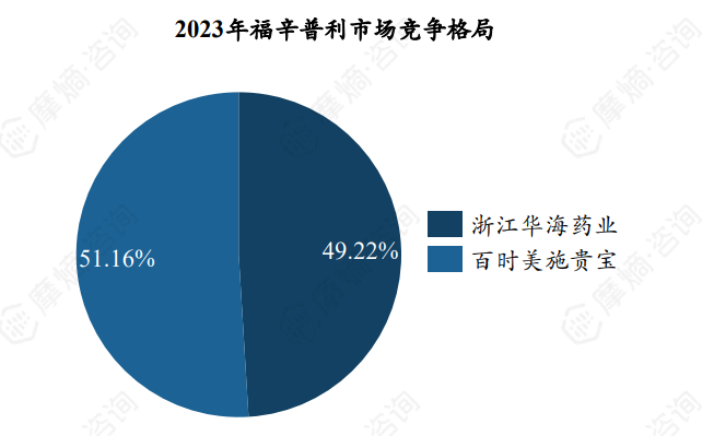 2015-2023福辛普利全国销售额呈明显的下滑趋势,2023年仅约1.27亿元,主要原因是纳入首批集采后降价。竞争格局方面,2023年原研企业BMS市场份额约51.16%,仿制药业华海药业抢占一半市场,2023年份额达49.22%。