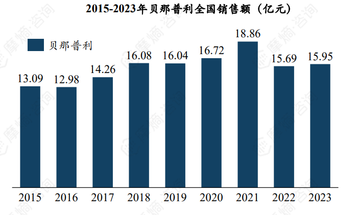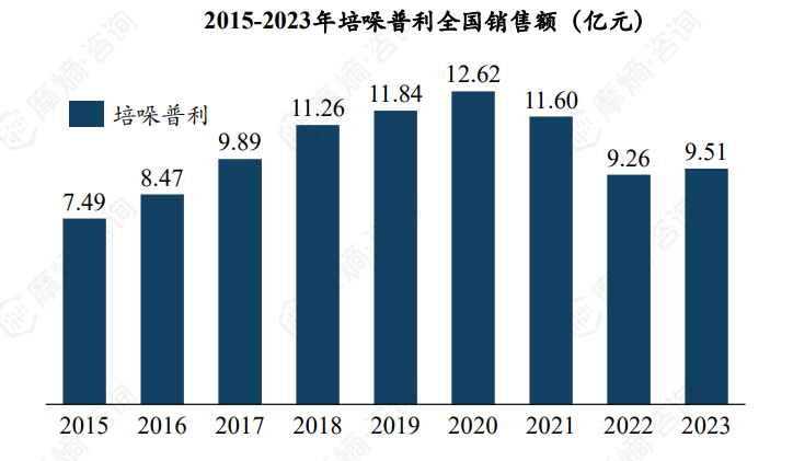 根据摩熵医药数据库统计显示,我国培哚普利全国销售额于2018年首次突破10亿元,并于2020年达到销售峰值12.62亿元,2021年入选第四批集采后,培哚普利销售额下滑明显,2023年仅剩约9.51亿元。