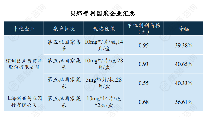 贝那普利于2021年进入第五批国家集采,中选企业有两家,