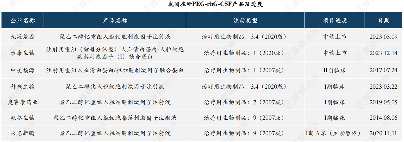 (1)PEG-rhG-CSF解决了rhG-CSF半衰期短问题,提高了疗效,目前已有7个产品上市