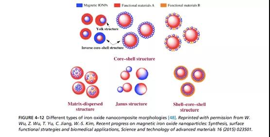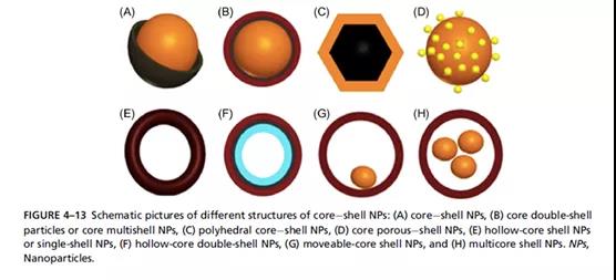 壳核NPs可以定义为由内层材料(内核)和外层材料(外壳)组成的结构。核心壳结构的几种组合可以制成:无机无机,无机有机,有机无机,有机有机材料。这一组合取决于应用领域。图4-13显示了不同种类的核壳NPs。通过包封不同壳层形成多壳或洋葱状(壳层数多于2或3个)的NPs,这类结构的SPIONs利用内核和壳层之间互不兼容的界面保护核内物质。