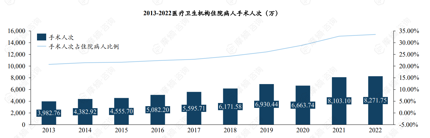 中国住院病人手术人次由2013年3982.76万人增长至2022年8271.75万人,十年间增长了1.08倍,手术人次占住院患者比例也已增长至33.5%。手术室内麻醉需求涵盖整个围手术期,手术需求的增加带来了麻醉药物需求的增长。