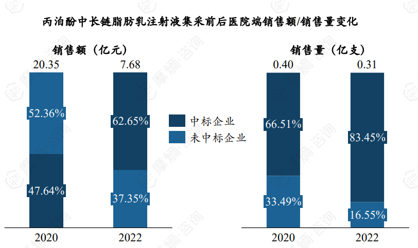 丙泊酚中长链脂肪乳集采后整体销售额与销售量均出现一定程度下滑。集采后中标企业销售额占比提升15.01%,销售量占比提升16.94%。