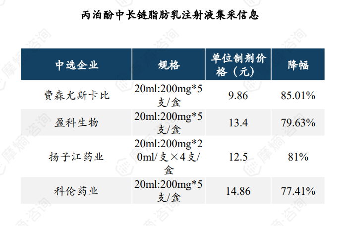 丙泊酚中长链脂肪乳被纳入第四批国家集中采购,共有四家企业中标,平均降幅为80.76%。原研费森尤斯卡比降幅最高,集采后一支价格仅为9.86元。