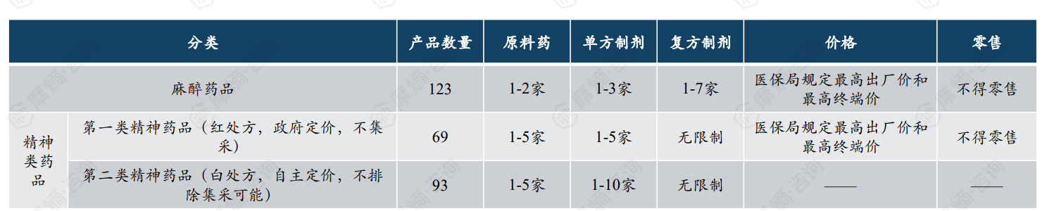 我国精麻药品受严格管制,国务院颁布的《麻醉药品和精神药品管理条例》中对精麻药品划分为:管制麻醉药品、一类精神药品、二类精神药品。由于精麻药品可能使患者产生依赖性和成瘾性,因而国家对精麻药品的种植、实验研究和生产、分销、定价都有非常严格的管制要求。