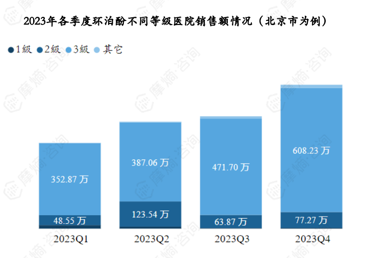 据摩熵药物流向数据显示,以北京市为例,环泊酚2023年各季度销售额呈上升趋势,2023Q4为全年最高,达到704.58万。销售市场主要以三级医院为主,各季度三级医院销售额占比均在70%以上。