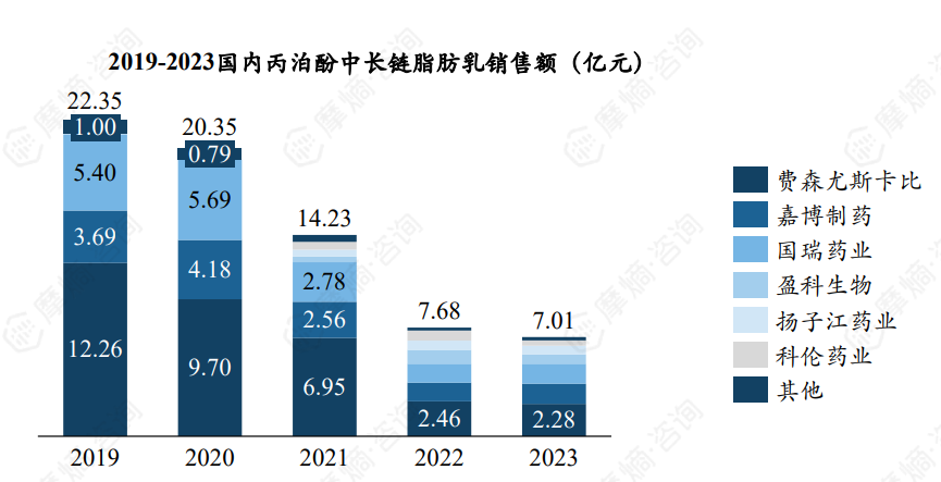 (2)2023年丙泊酚中长链脂肪乳销售额为7亿元,原研占据最大市场份额