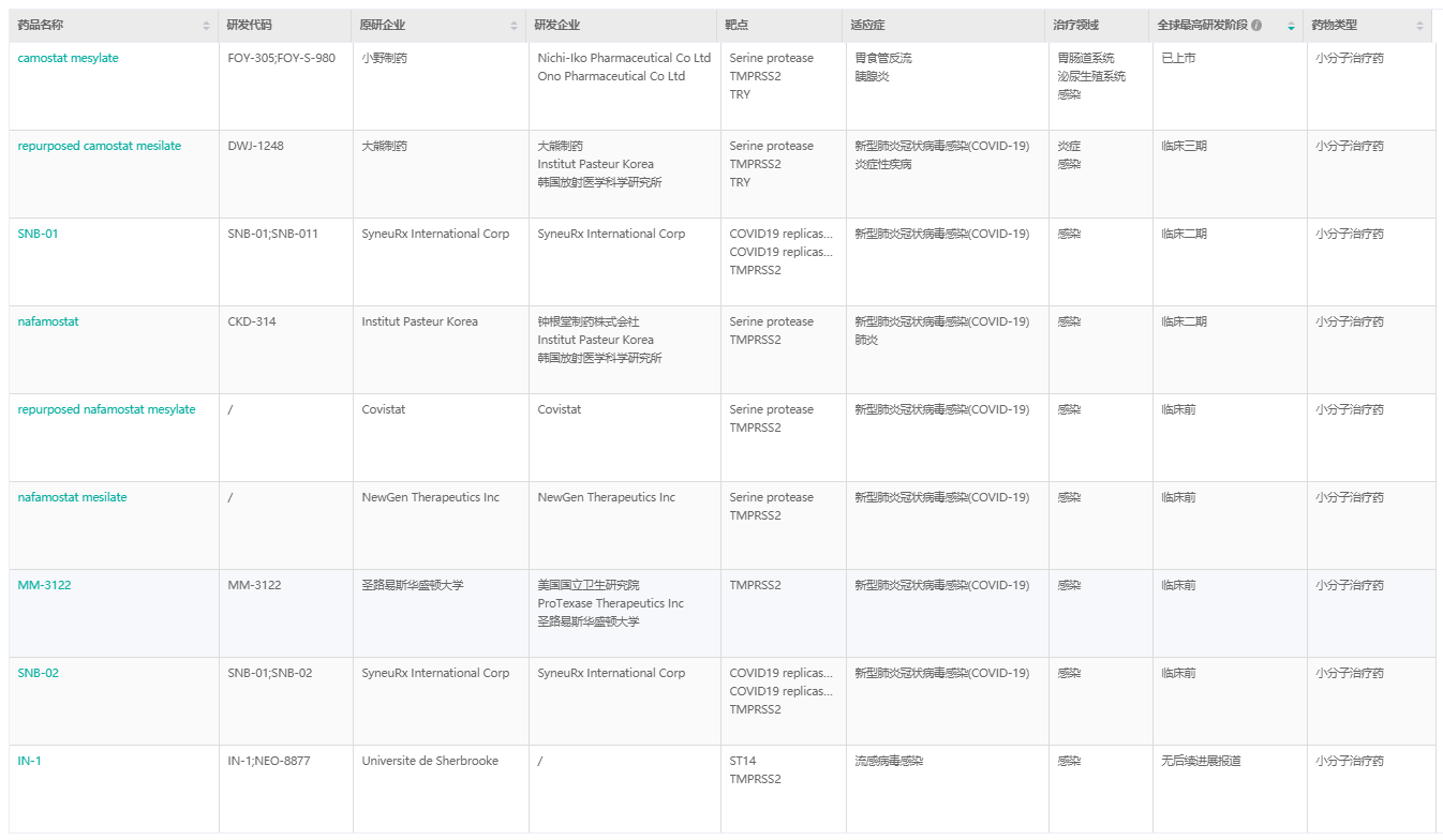布局TMPRSS2靶点的药物有8款,其中,有一款已上市,是适用于胃食管反流、胰腺炎的。其余都是针对新型肺炎冠状病毒感染(COVID-19)的,一款处于临床3期,两款处于临床2期,以及四款处于临床前阶段。