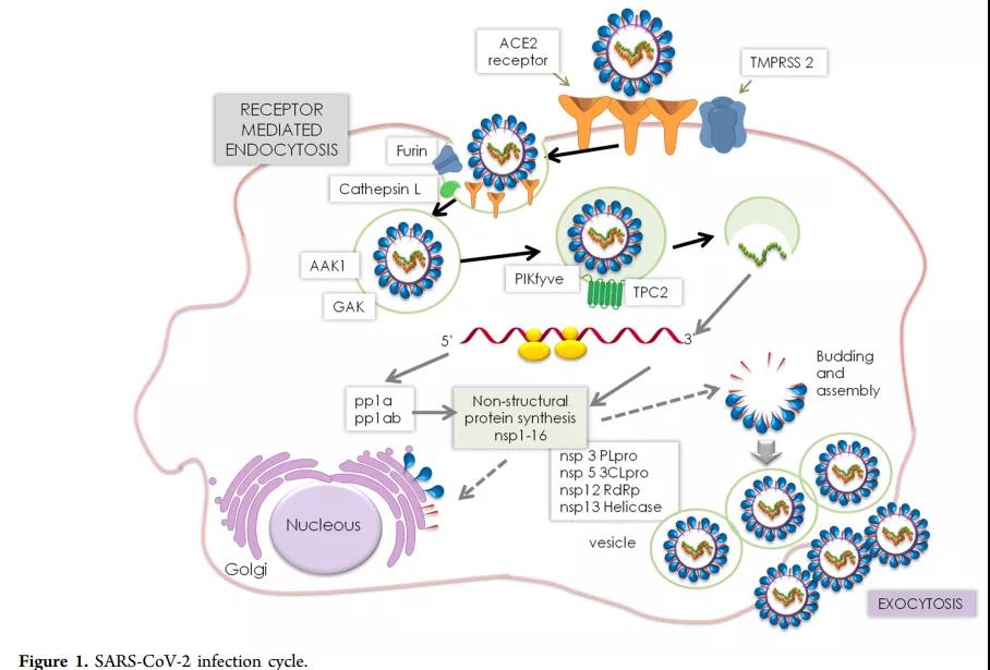 SARS-CoVs的主要进入途径是受体介导的胞吞作用。AAK1和GAK是宿主丝氨酸-苏氨酸蛋白激酶,可调节多种无关RNA病毒(例如狂犬病,埃博拉病毒,登革热或丙型肝炎病毒)的进入,组装和释放过程中的细胞内病毒运输。