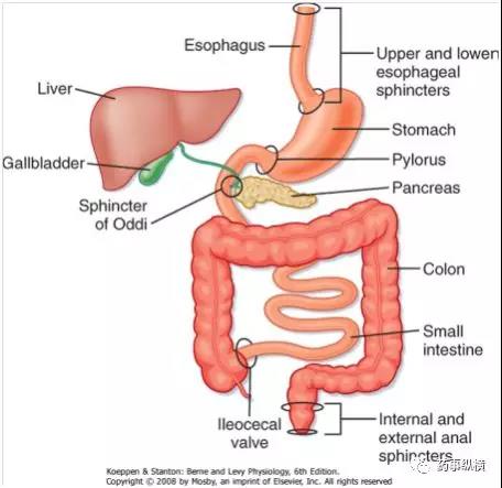 如下图所示,固体制剂经温水服用后,通过食道经贲门后进入胃环境(食道内径约为2-3cm,亦有资料提及食道内径约为17-23mm,扩张条件下可达35mm);胃是口服药物进入胃肠道的主要通道 ,在这里速释(IR)制剂快速崩解,使活性药物成分(原料药)能够在它到达吸收部位已实现完全溶解,通常情况下药物经一定水量送服之后胃容积约达到300-500ml;药物抵达胃部之后会经胃排空作用使之从为幽门(Pylorus)进入十二指肠(十二指肠顾名思义约为12个指头的并列长度,约为20+cm),十二指肠是物质从胃部向肠道过渡的主要部位与之相连的胰腺(pancreas)和胆囊(gallbladder)对其环境的改变有重要影响;经十二指肠后进入最主要的吸收部位——空肠以及回肠,人体小肠由于其特有的褶皱以及微绒毛等结构使之具有约200m2 吸收表面积,如此巨大的表面特性为药物吸收提供了广阔的环境, 一般情况下药物到达该部位已基本完全释放,在此部位主要是药物的跨生物膜转运阶段。