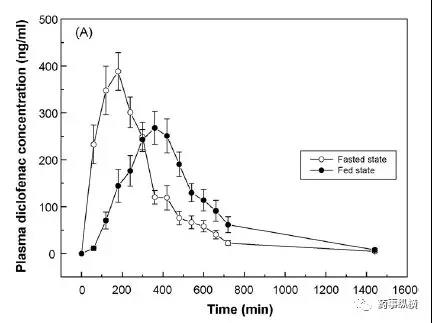 上图显示在模拟空腹和餐后的溶出介质中,往复桶法和流通池法均表现出相似的溶出趋势即模拟空腹介质中溶出均快于模拟餐后介质。该信息提示双氯芬酸钠缓释微丸在体内不同进食条件下或将表现出不同的释放趋势,然QC方法是无法给予这方面信息的支持。基于上述假设进行了模型药物的体内研究。