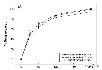 上图显示在QC介质以及不同转速以及不同装置条件下溶出趋势无显著差异,并且观察到缓释制剂在120min内即可完成85%以上的释放。