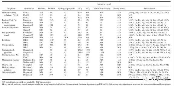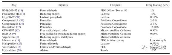辅料自身含有的特殊杂质在药物相容性研究中需要密切关注。辅料中常见杂质有:乙醛、还原糖、过氧化物、硝酸盐、亚硝酸盐、金属及溶剂等残留。