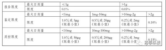 ICH Q3B是新药制剂中杂质研究的基本指南。通常情况下,存在于原料药中的非降解杂质、辅料中的杂质或包装容器渗出的杂质,在制剂中不进行监控。新制剂关注生产过程及稳定性考察中所发现的降解杂质,有三限(报告限、鉴定限、界定限)要求,它的限度接受要求可参考下表。