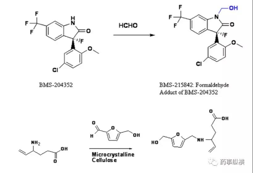 - 醛类杂质。甲醛、乙醛和糠醛(可能还有其他醛)是常见的醛杂质,它们存在于淀粉、预糊化淀粉、交联聚维酮、羟丙基纤维素、聚乙二醇和乳糖中醛类与活性成分中的伯胺、肿胺、酮基邻位碳易发生反应。如下图所示:、