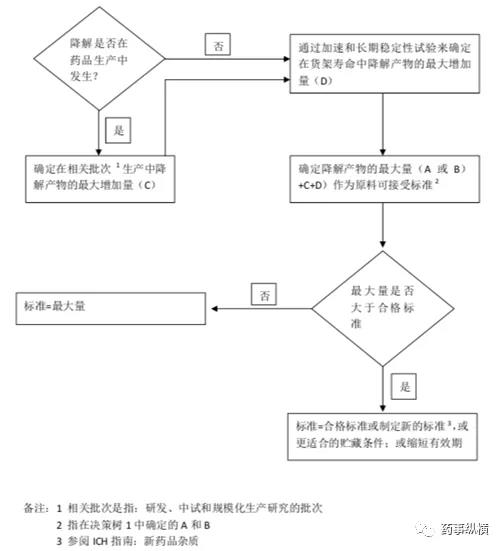 制剂质量标准制定时应包括在上市产品生产和推荐的贮藏条件下预期会出现的降解产物,这些降解产物可参考上市或拟上市生产工艺中发现的降解产生来确定。质量标准制定的决策树参考下图。