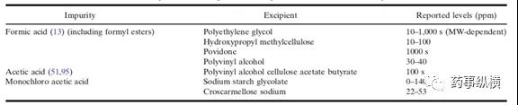 - 有机酸:辅料中的一些有机酸如甲酸、乙酸、一氯乙酸常出现在辅料聚乙二醇,羟丙基甲基纤维素,聚维酮,聚乙烯醇,聚乙烯醇醋酸纤维,丁酸淀粉乙醇钠,交联羧甲基纤维素钠当中,如表3。