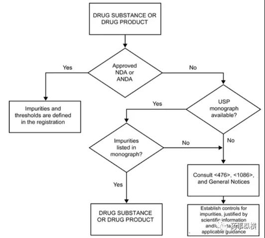 USP通则<1086, 原料药和制剂杂质>是原料药和制剂中杂质的研究与控制指南。制剂中杂质是制剂中降解的有机杂质。USP在2017年新建立了一个通则<476, 原料药与制剂的杂质控制>,主要内容是药典各论中已有的原料药与制剂中杂质分析测试与控制,提出了有机杂质控制决策树,如下图,具体内容可参考PF43(6)。