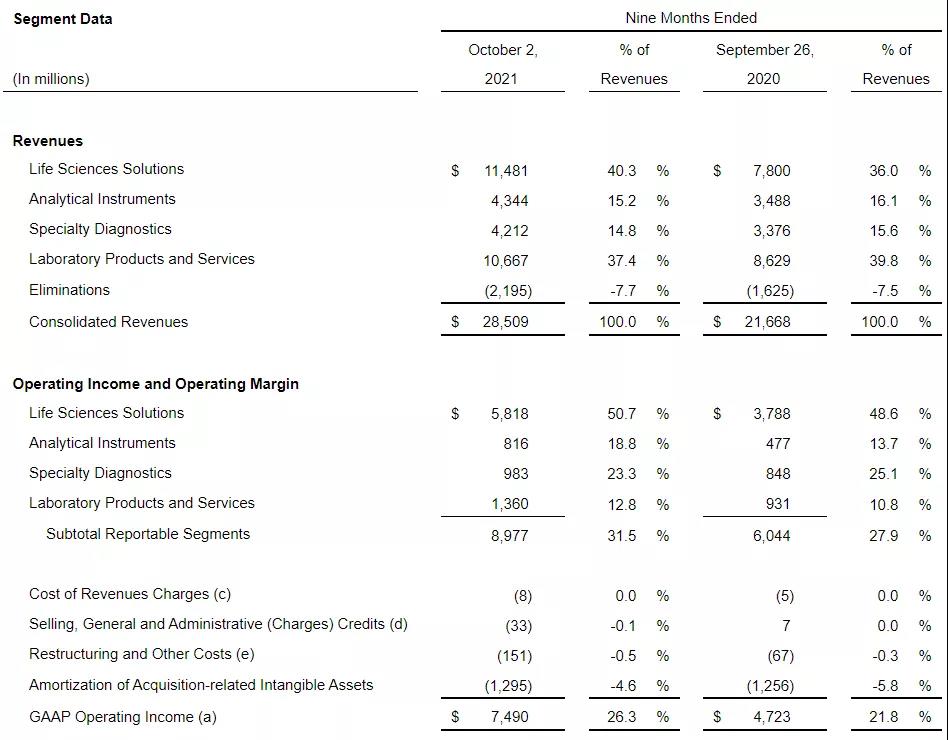 分部门来看:2021年前三季度,赛默飞生命科学解决方案部门收入同比增长47%至114.8亿美元,占合并收入的40.3%,而去年同期收入为78亿美元。调整后部门营业利润率为50.7%,而去年同期为48.6%。该部分业务主要由诊断COVID-19的检测需求以及生物科学和基因科学产品销量增长而推动;