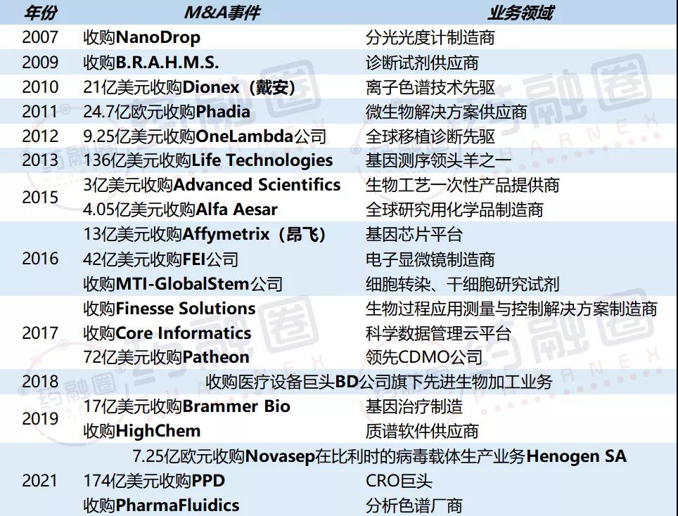 收购PPD之前,赛默飞近几年在制药和生物技术领域的M&A布局