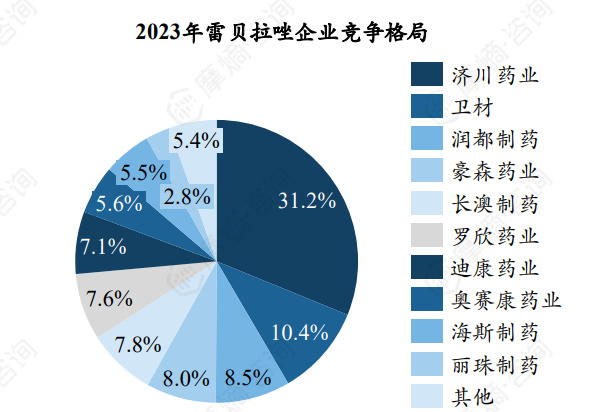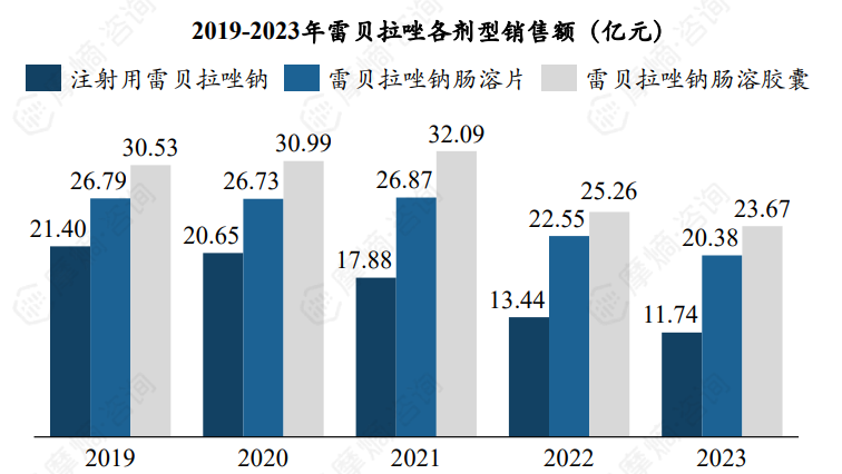 国内上市销售主要剂型为肠溶胶囊、肠溶片及注射剂。根据摩熵医药数据库统计显示,2023年雷贝拉唑销售额55.79亿元,虽然较前几年有所降低,但因降幅较小,因此整体市场为居于所有质子泵抑制剂首位。济川药业是雷贝拉唑领军企业,市场份额超30%,其胶囊剂市场规模最大,且具有绝对优势。