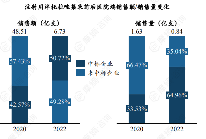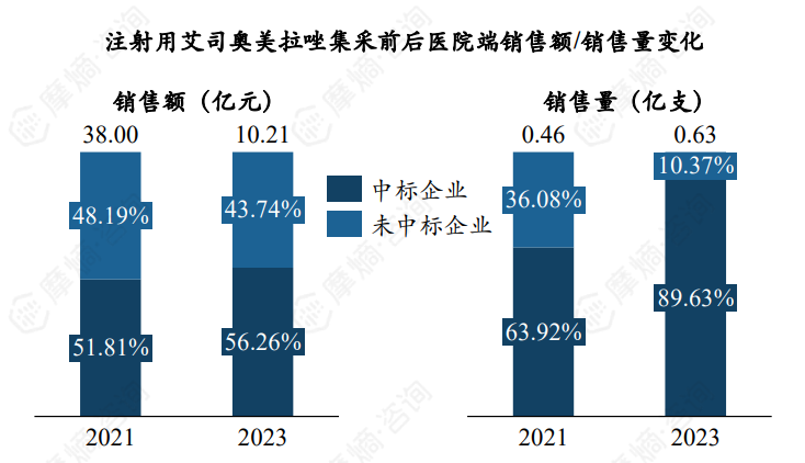 注射用泮托拉唑被纳入第四批国家集中采购,奥赛康、扬子江、中美华东等六家企业中选,平均降幅为88.49%。集采后中标企业销售额占比增加了8.15%,销售量占比增加了31.43%。