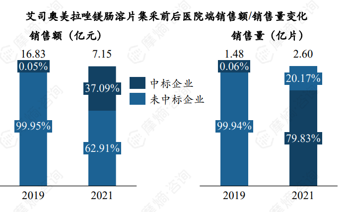 艾司奥美拉唑肠溶片与艾司奥美拉唑肠溶胶囊均被纳入第四批集采。艾司奥美拉唑肠溶片仅山香药业一家中选,集采前由阿斯利康近乎占据全部市场,集采后山香药业迅速抢占市场,销售额增至37.09%,销售量增至79.83%。艾司奥美拉唑肠溶胶囊由石药欧意、东阳光和正大天晴中选,集采前后均由这三家企业占据近乎全部市场。