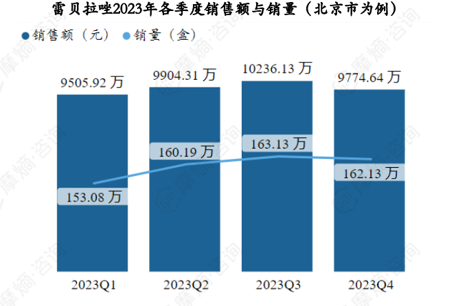 据摩熵医药药物流向数据显示,以北京市为例,雷贝拉唑2023年各季度销售量和销售额如下图: