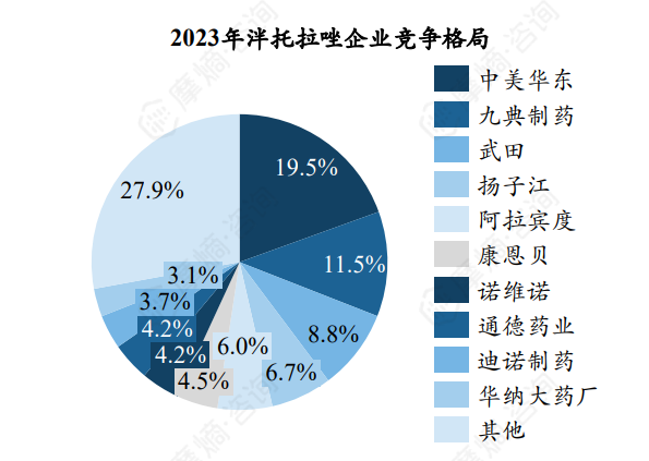 国内上市销售剂型主要为肠溶片、肠溶胶囊和注射剂,根据摩熵医药数据库统计显示,整体市场在2019年销售额达到了102亿元,但在注射剂与肠溶片进入集采后市场大幅下降,到2023年已经下降至14亿元,较2019年相比下降超过85%。泮托拉唑在售企业近百家,竞争激烈,TOP3企业为中美华东、九典制药和武田,占比分别为19.5%、11.5%和8.8%。