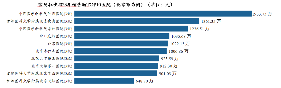 雷贝拉唑2023年销售额TOP3医院(北京市为例)分别为中国医学科学院肿瘤医院、首都医科大学附属北京安贞医院、中国医学科学院阜外医院。
