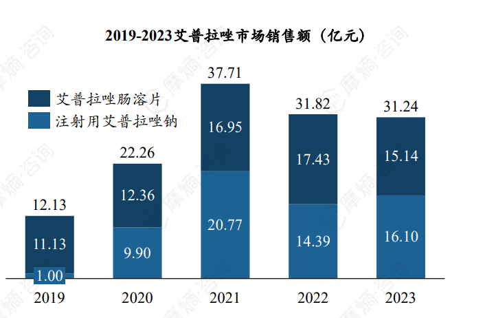 艾普拉唑是丽珠医药从韩国一洋药品株式会社引进,其销售额在2021年达到峰值37.71亿元,随后因注射剂进入医保,价格由206元/支降至71元/支,整体市场略有下降,2023年销售额达31.24亿元,在整体质子泵抑制剂中位于第三位。