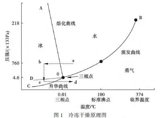 根据热力学相平衡理论,当压力降到一定真空度,水的沸点和冰点就会重合,冰会直接变成水蒸气,即发生升华。即恒温时降低压力或恒压时升高温度都可以打破固、气两相平衡,使固态直接转变成气态;冷冻干燥就是根据这个原理进行的3,4。