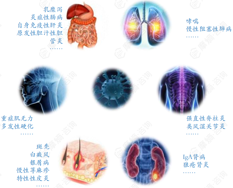 消化:炎症性肠病、自身免疫性肝炎、原发性胆汁性胆管炎、乳糜泻等。