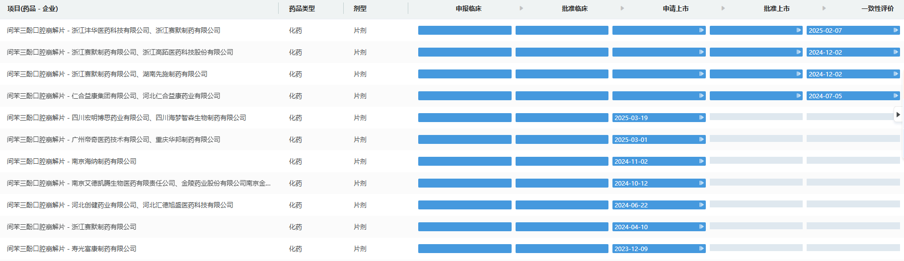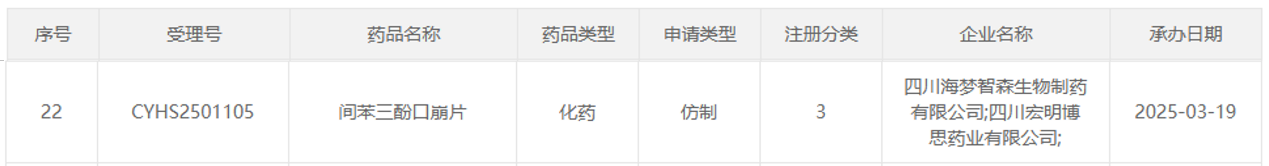 3月19日,据CDE官网显示,四川海梦智森生物制药提交的3类仿制药间苯三酚口崩片上市申请已获受理。根据摩熵医药数据库显示,此次上市申请获受理的品种为四川海梦智森旗下间苯三酚口崩片新剂型,此前该品种已上市产品主要为间苯三酚注射液和注射用间苯三酚两款。