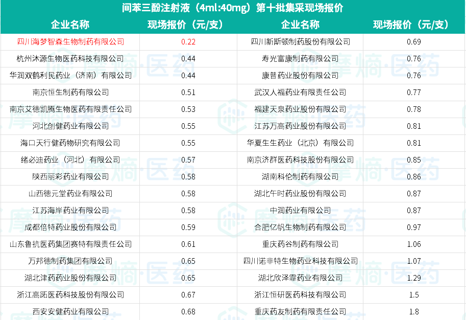 12月30日,第十批集采最终结果公布,四川海梦以0.22元/支(规格为4ml:40mg)的价格拿下河北、黑龙江、四川、云南和陕西五个省份,这一价格比次低价0.44元/支低一半。