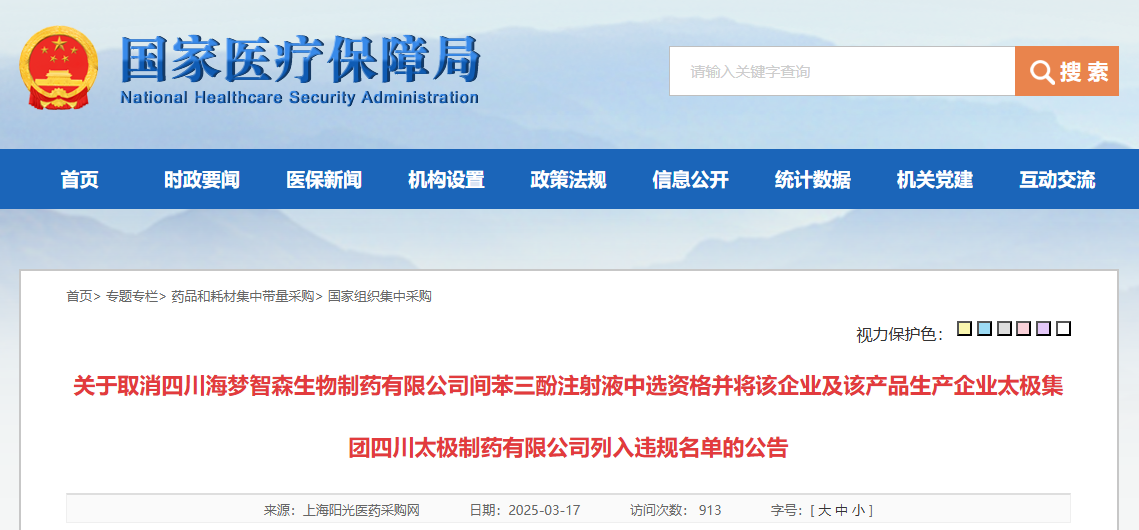 3月17日,国家组织药品联合采购办公室发布通知,取消四川海梦智森生物制药有限公司间苯三酚注射液第十批国采中选资格,并将该企业及其生产企业太极集团四川太极制药列入违规名单。