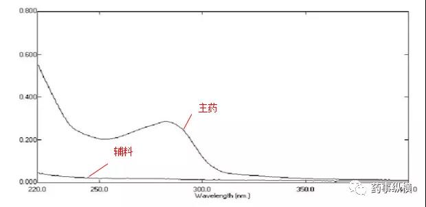 - 查看辅料和主药的光谱图,一般辅料在低波段的吸收均较大(250nm之前),从此波长往后找,看能否找到辅料的吸收几乎没有(贴近零线)而主药的吸收仍然较大的波长。如果此波长是主药的吸收峰,那更好了。如果不是吸收峰,较平坦处也行。前两者都不是,在陡坡处的波长也能勉强测定,现在UV仪的波长精度较好,误差不会太大。