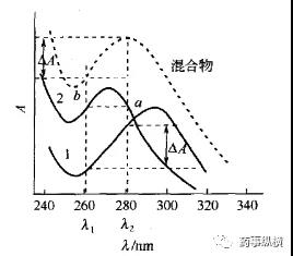 如此,求得的差值A(λ2)- A2(λ1)就是主药在λ2处的吸收度A1(λ2)。此法测定必须符合两个基本条件:1)干扰组分辅料在这两个波长应具有相同的吸收度;2)待测组分在这两个波长处的吸收度差值应足够大,即主药在λ2处的吸收度较大,而在λ1处几乎没有吸收。大部分品牌的UV工作站都能进行双波长测定,如岛津的UVprobe和安捷伦的21CFR紫外工作站,有的还能直接读出双波长间的差值。所以如能满足上述条件,测定过程也相当简便,主要是能很好地消除辅料的干扰。下图虽不是实际案例,但通过此示意图能方便理解。