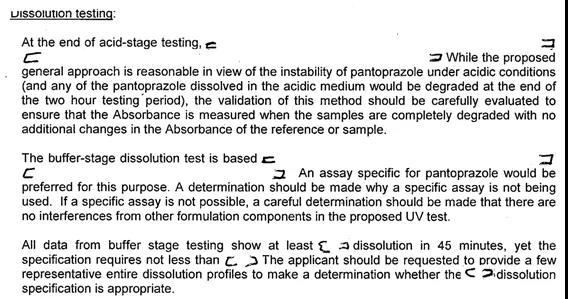 FDA审评报告显示,泮托拉唑钠肠溶干混悬剂在酸阶段及缓冲液阶段均采用非专属性的紫外法进行产品溶出水平的检测。原因分析如下: