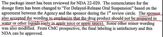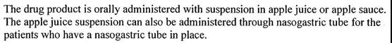 本品是用果汁或果酱制备混悬剂,然后进行口服,或者是将产品用果汁配制成混悬液,然后通过鼻胃管给药。明确指出该肠溶干混悬剂不能用水配制混悬液,而是选用偏酸性的果汁或果酱进行混悬液的配制。原因是不同来源的水会有不同的pH值(其pH范围可能在5.5~8.5之间波动),这就引起一种担忧,即如果用水作为载体配制混悬剂,可能会破坏肠溶衣的完整性,所以本品建议采用偏酸性的果汁或果酱作为载体配制混悬剂,确保肠溶衣的完整性。