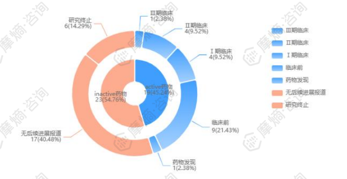根据摩熵医药-靶点格局数据库,全球暂无靶向IL-8的药物获批上市,临床Ⅲ期管线有1项(占比2.38%),临床Ⅱ期管线有4项(占比9.52%),临床Ⅰ期管线有4项(占比9.52%),进展至临床的管线占比超过20%。