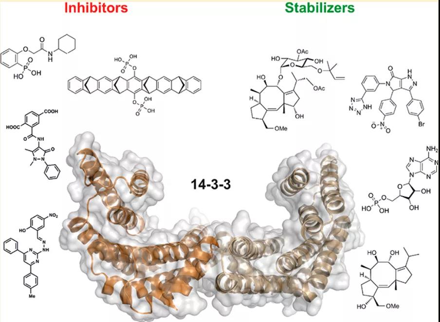 许多疾病相关蛋白具有传统小分子药物无法靶向的固有疾病区域。已经鉴定出数千种具有这种内在无序区域的蛋白质,它们与中枢蛋白 14-3-3 相互作用。在与无序蛋白质区域结合时,14-3-3 诱导有序,赋予成药性。