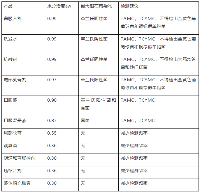 注(note):TAMC= 需氧菌总数;TCYMC= 霉菌和酵母菌总数。表中列出的不同剂型产品的水分活度aw是代表性的,生产商在开发药品的微生物限度检查策略之前仍需要检测所制备产品的水分活度aw