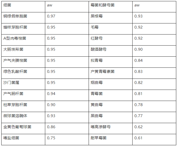 用于控制微生物导致的变质,水分活度aw是比水分含量更重要的一个参数,它是产品中微生物可利用水的量度,是影响微生物生长的关键因素之一。在微生物学中细菌、酵母菌和霉菌的新陈代谢、繁殖、孢子萌发和生存需要可利用水,水分活度aw是反映存在于产品中微生物新陈代谢的可利用水(非结合水或自由水)的量度。因此水分活度aw是预测产品中潜在微生物生长繁殖的有力工具。水分活度aw可反映产品中潜在微生物的生长繁殖。各类微生物生长都需要一定的水分活度aw,换句话说,只有水分活度aw大于某一临界值时,特定的微生物才能生长,水是微生物繁殖的必需条件。下表给出了代表性微生物生长所需要的最低水分活度aw: