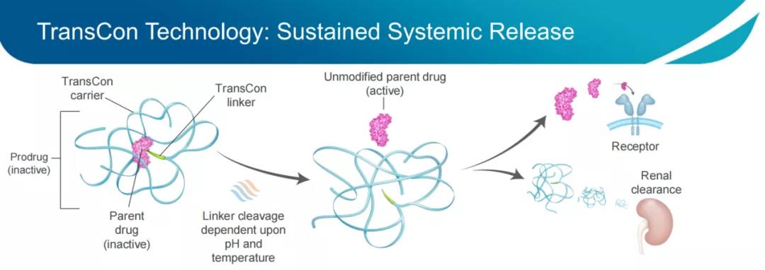 TransCon技术的关键在于将原型药物与PEG载体之间用了一个连接子(Linker)相连,传统的PEG修饰会使PEG聚合物缠绕在药物周围,形成“笼子”结构,药物的组织穿透性、受体亲和性变差,且高分子PEG修饰使药物难以从血液循环中进入组织,从而需要提高给药浓度来达到相应的效果,这增加了发生副作用的风险,而使用TransCon技术能够有效规避这种情况。当药物注射到体内时,Linker可在生理pH和温度条件下自动水解,并释放出未经修饰的原型药物,以原始药理机制发挥作用,而PEG载体和Linker则经由肾脏排出体外。基于该技术开发的药物具有两点明显的优势:一是独立于酶活性和组织条件,原型药物的释放仅由pH和温度决定,可根据所需药代动力学特征定制给药剂量与释放时间;二是Linker水解后所释放的是未经修饰的原型药物,保留了其原有的临床特性与作用机制,利用已经证实疗效、经过验证的原型药物,潜在地提高了药物开发成功率。