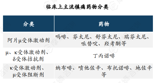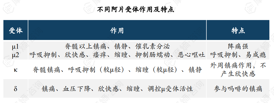 阿片类镇痛药是一类通过激动外周和中枢神经系统μ、κ和δ阿片受体而发挥镇痛作用的药物,目前主流的的中枢性镇痛药是阿片受体完全激动剂、阿片受体部分激动剂及阿片受体混合激动-拮抗剂。