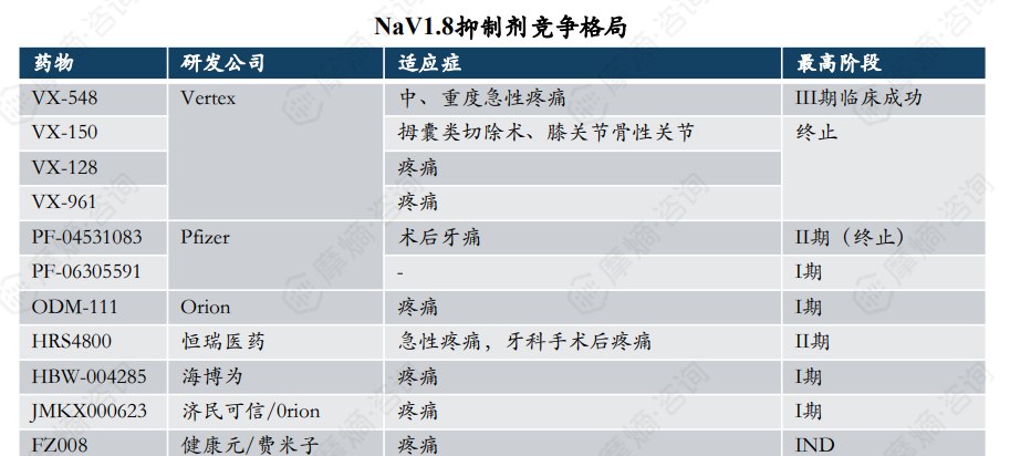 目前全球NaV1.8抑制剂研发管线并不多,研发难度大,辉瑞,雅培,Vertex均陆续折戟。Vertex最新一代抑制剂VX-548,是目前全球进度最快且唯一III期临床成功的NaV1.8抑制剂。