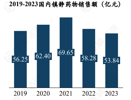 镇静药物近几年受集采影响市场规模有所降低,2023年为53.84亿元。