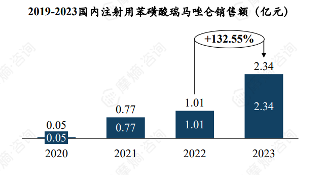 据摩熵医药数据库统计显示,2023年,注射用苯磺酸瑞马唑仑的销售额达到了2.34亿元,较2022年实现了132.55%的显著增长。同年,注射用甲苯磺酸瑞马唑仑的销售额也达到了2.54亿元,与2022年相比增长了51.83%。