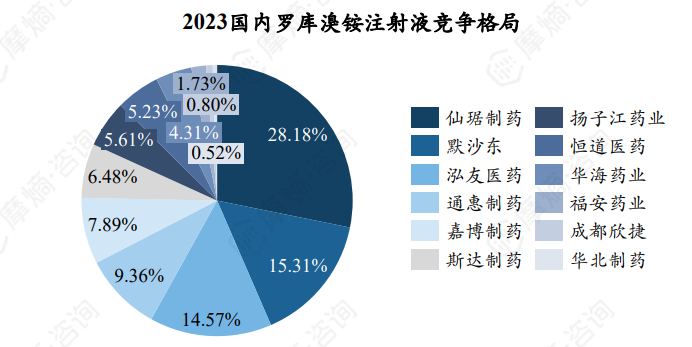 据摩熵医药数据库统显示,罗库溴铵在2021年销售额突破10亿元,然而在2022年被纳入国家第七批集中采购名单后销售额急剧下滑,2023年已缩减至5.51亿元。仙琚制药是罗库溴铵领军企业,占据28.18%市场份额,紧随其后的是默沙东与泓友制药,分别拥有15.31%和14.57%的市场份额。